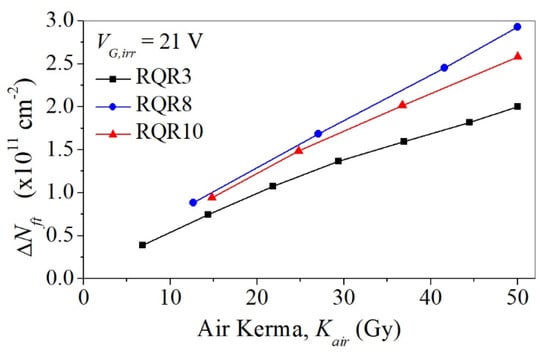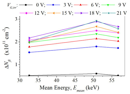 Figure 8 shows the dependence of ∆Nft at Kair = 50 Gy on mean beam energy, Emean. The behavior is the same for all applied voltages, as in the case of VG,irr = 21 V shown in Figure 4, including zero polarization [].