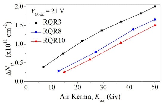 The dependence of the density of FTs and ∆Nft on Kair for VG,irr = 21 V is shown in Figure 4. ∆Nft is the highest for the RQR8 beam but the lowest for RQR3. ∆Nft also shows this behavior for the other used polarizations (not shown), except for VG,irr = 0 V, analyzed in [], where ∆Nft is also the highest for the RQR8 beam but almost the same for the other two beams. Figure 5 shows that ∆Nst is about 50% less than ∆Nft for VG,irr = 21 V, and ∆Nst is the highest for RQR3 and the lowest for RQR10. VG,irr = 0 V shows opposite behavior, and ∆Nst is the highest for the RQR10 beam but the lowest for RQR3 [].