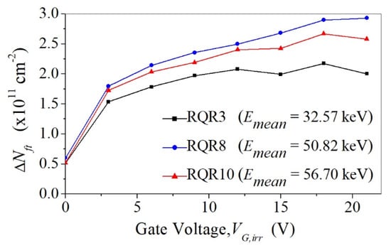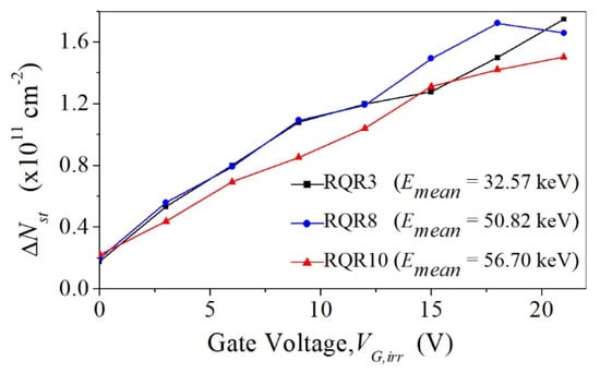 ∆Nft = f(VG,irr) dependence is not linear, and it is not possible to find a simple parameter similar to sensitivity by which we could easily consider the dependence of ∆Nft on VG,irr. Therefore, ∆Nft at a certain Kair should be considered, and it is best to take the last point during irradiation, i.e., Kair = 50 Gy. The same goes for ∆Nst = f(VG,irr). The values of ∆Nft at 50 Gy are presented in Figure 6, showing that the highest density is for RQR8 and the lowest for the RQR3 beam. This behavior corresponds to the sensitivity shown in Figure 3. However, ∆Nst does not show any clear dependence on VG,irr as ∆Nft (Figure 7). ∆Nft is twice as large as ∆Nst and has a more dominant effect on ∆VT than ∆Nst. Although ∆Nft contribution to ∆VT is still significant, it is much lower than in the case of gamma radiation of VDMOSFETs, when ∆Nft is usually more than five times higher than ∆Nst [,].