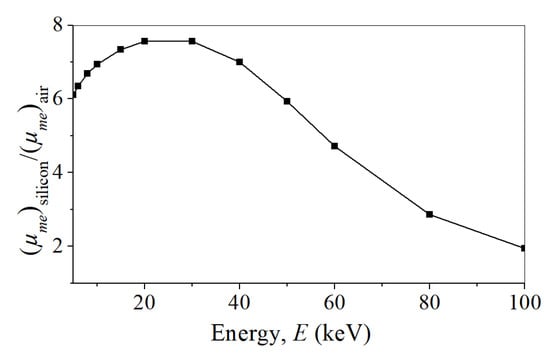 Unfortunately, we were not able to find the values for (µme(E))SiO2 in the literature. Therefore, instead of (µme(E))SiO2, we used the mass energy-absorption coefficients of silicon, (µme(E))Si, given in Ref. []. This difference can be significant for energies less than 100 keV. In Figure 9, the (µme(E))Si/(µme(E))air ratio in terms of beam energy is shown. If we compare the results from Figure 9 with the results from Figure 8, it can be concluded that they do not agree. Namely, on the basis of Figure 9, the sensitivity is expected to decrease with the mean X-ray energy in considered range from 32.57 to 56.70 keV. The reason for this discrepancy between the results from Figure 8 and Figure 9 may lie in the fact that either (µme(E))Si coefficients for silicon are not suitable to be used for SiO2 or/and the mean energy is not a true indicator of the X-ray beam.