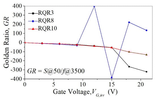 where S is the sensitivity and f(tmax) is the fading at the last point of SA (in our case, tmax ≈ 3500 h, i.e., about 5 months). The higher GR represents better dosimetric characteristics of the transistor that should have a large S and a small f (GR should be as high as possible). This means that GR can be used as a good parameter to compare different transistors or to examine the effect of operating conditions (e.g., as in our case, different gate voltages). The GR is displayed in Figure 11, showing that the highest GR (the best dosimetric characteristic) is for RQR8 and VG,rad = 12 and 15 V.