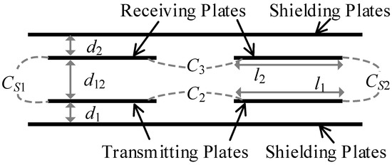 A capacitive coupler that consists of six rectangular metal plates was used in this experiment. The typical structure is shown in Figure 1. l1 and l2 are the plate lengths, d1, d2, and d12 are the airgap distances. There were 15 coupling capacitors in the six-plate coupler and the performance of this structure can be characterized by four primary capacitors, CS1, CS2, C2, and C3. CS1 and CS2 represent the equivalent mutual capacitors between the transmitting plates and receiving plates; C2 and C3 represent the equivalent self-capacitors between the transmitting plates or between the receiving plates. The equivalent circuit model with four coupling capacitors is shown in Figure 2a [48]. Due to the fact that the capacitors CS1 and CS2 are connected in series, the coupling capacitor CS can be further simplified, where