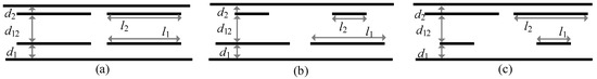 As described in [50], a symmetric CPT system with an identical transmitter and receiver is verified to be an efficient configuration. However, the shielding distances d1 and d2 tend to have large values (usually in the range of 50 mm to 100 mm) in order to achieve high system efficiency. For space-limited scenarios, such as EV wireless charging applications, the limited space in the receiving side determines that the shielding distance d2 cannot be very large. Therefore, an asymmetric coupler with different distances d1 and d2 (where d1 > d2) is more practical in EV wireless charging applications. According to the different plate lengths l1 and l2, the asymmetric structure can be divided into three categories: l1 = l2, l1 > l2, and l1 < l2, as shown in Figure 3.
