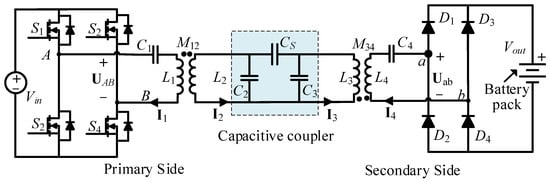 In this study, an EFR compensation network was used. With the asymmetric capacitive coupler that is shown in Figure 3c, the equivalent circuit model of the asymmetric CPT system is shown in Figure 4, where C3 is greater than C2. The EFR compensation circuit was formed by L1, C1, L2, C2, L3, C3, L4, and C4. M12 and M34 represent the mutual inductances between L1 and L2 and between L3 and L4, respectively. CS represents the mutual capacitance in the capacitive coupler. Vin and Vout are the input and output direct current (DC) voltage sources, respectively. The capacitors C2, C3, and CS achieve EFR in the compensation circuit and the EFR is resonant with the inductors L2 and L3 at an angular frequency of ω0. Besides this, C1 and C4 are resonant with L1 and L4 at an angular frequency of ω0, respectively.