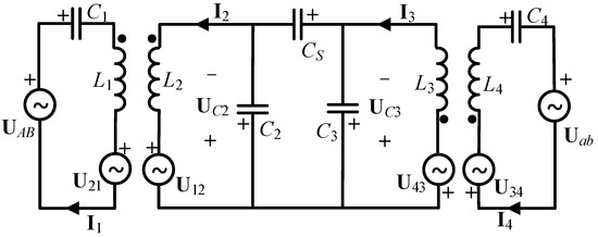 As shown in Figure 5, the equivalent circuit model of an EFR-based CPT system can be obtained according to the method of fundamental harmonics approximation. The internal resistances of all of the circuit components are ignored. U21, U12, U43, and U34 represent the induced voltage sources that are generated in the coupling inductors L1, L2, L3, and L4. UAB and Uab represent the input and output AC voltages, respectively, where