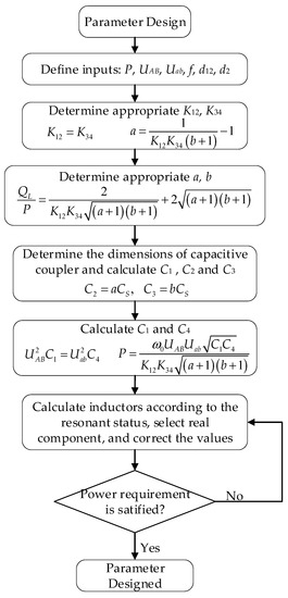 From the above analysis, a general parameter optimization method that is based on equal reactive power can be obtained. Figure 6 shows the design flowchart. Considering the actual application scenarios, the system requirements are given and defined as inputs. The optimized coefficients K12, K34, a and b can be obtained by Equations (25), (28) and (29). Based on Equation (27), the relationship between the coupling capacitors can be derived. With the given airgap distances d12 and d2, an appropriate capacitive coupler with optimized coupling capacitors can be determined. According to Equations (26) and (27), the optimized C1 and C4 can be obtained. The resonant inductors can then be obtained by using the resonant conditions. Finally, the parameters can be adjusted iteratively depending on the available commercial inductors and capacitors.