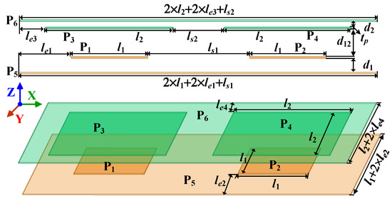 In this study, the asymmetric six-plate capacitive coupler was formed by 2 mm-thick aluminum plates. The structure is shown in Figure 7 and the dimensions of the designed coupler are shown in Table 2. The transmitting plates and receiving plates are square and centrosymmetric. On the receiving side, the plate length l2 was 600 mm, the shielding edges le3 and le4 were both 50 mm, and the plate separation ls2 was 100 mm. The distance d2 was 20 mm and the transmission distance d12 was 100 mm. The remaining dimensions of the transmitting side were plate length l1 and distance d1.