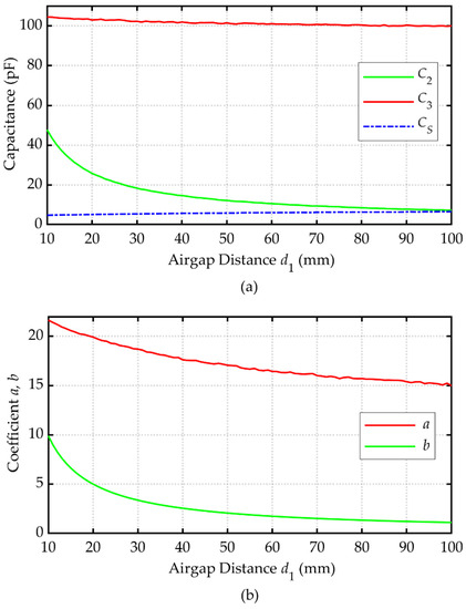 The only parameter that needed to be seriously considered was the gap distance d1. When other parameters are determined, the variation of d1 can affect the values of the coupling capacitances, which can be simulated by using ANSYS Maxwell. Figure 9 shows the simulated values of C2, C3, and CS and coefficients a and b under different values of airgap distance d1.