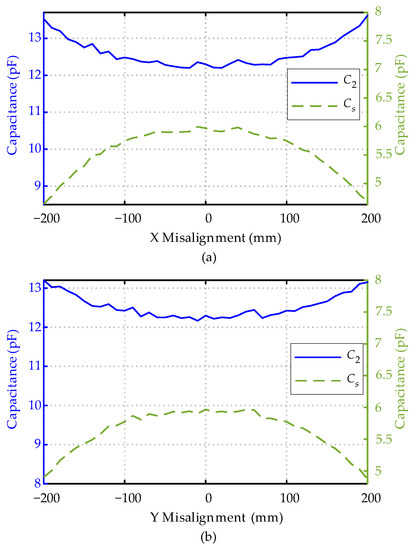 Via the finite element simulation software ANASYS Maxwell, the performance of the capacitive coupler with the given parameters was simulated. Figure 12 shows the simulated capacitances C2 and CS under different X and Y misalignments. With an increasing misalignment condition, the simulated C2 values increase while the CS values decrease.
