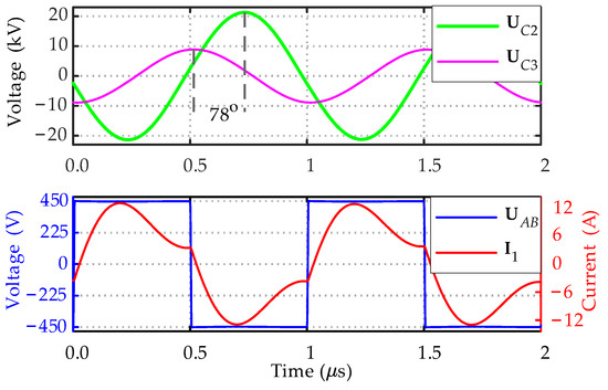With the given system parameters, the other resonant parameters can then be obtained. Considering the power losses in an actual system, the transferred power that is used to calculate the circuit parameters should be set slightly higher than the rated value. Based on Equations (6) and (31), the capacitances C1 and C4 can be calculated as.