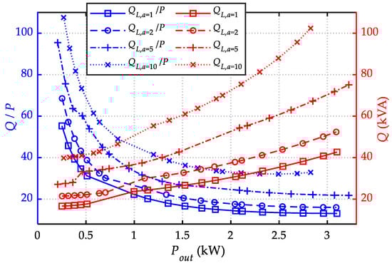 The simulated values of QL and QL/P under different values of the coefficient a are shown in Figure 15. The results show that the reactive power increases with increasing output power and coefficient a value and the ratio of QL/P increases with increasing coefficient a value and decreases with increasing output power. In this study, the coefficient a was set to 2, and the value of QL/P at the rated power was approximately 17, which agrees well with the designed value.