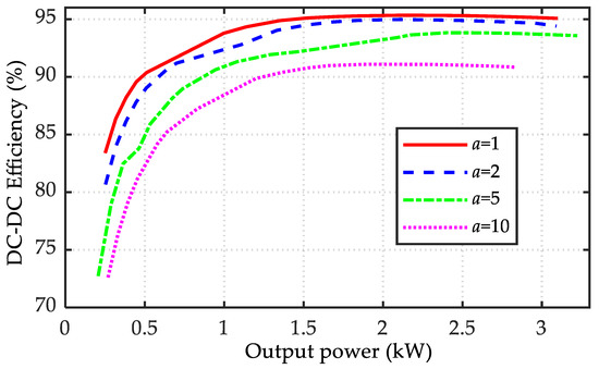 The system efficiency under different values of the coefficient a was simulated and the results are displayed in Figure 16. The results show that the system efficiency increased with increasing output power and it decreased with increasing values of the coefficient a. The trend of system efficiency in Figure 15 is opposite to that of QL/P in Figure 15, which agrees well with the analysis.