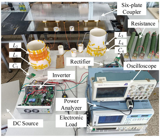 To verify the proposed method, a 3.2-kW CPT prototype was built as shown in Figure 17. The asymmetric capacitive coupler with a large receiver and small transmitter was made up of six aluminum plates. The plates were held by PVC tubes and ceramic insulators and the outside shielding plates were floating. Under the capacitive coupler, a black steel plate was used as the ground. The mutual capacitance was 6.75 pF and the transferred distance was 100 mm. Just like the schematic circuit that is shown in Figure 4, a DC power source was used in order to provide a DC voltage to the inverter on the transmitting side of this prototype. An electric DC load, together with several parallel-connected resistors, was used as the load and connected to the rectifier on the receiving side. The power converters were formed by SiC devices IMZ120R045M1 and IDW40G120C5B. The inductors L1–L4 were wound onto the PVC tubes with 1200-strand Litz wire with a diameter of 0.04 mm, which allowed easy adjustment of the coupling coefficients K12 and K34. The compensation capacitors consisted of high voltage, low dissipation factor ceramic capacitors.