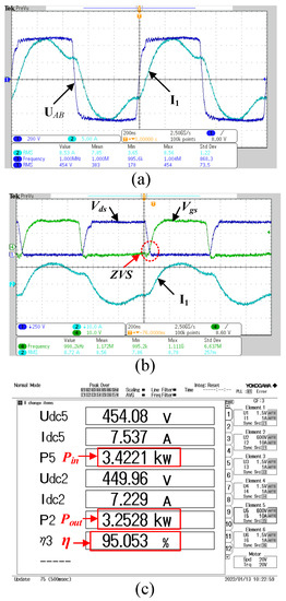 Experimental Results. (a) Experimental UAB and I1. (b) ZVS condition. (c) System efficiency.