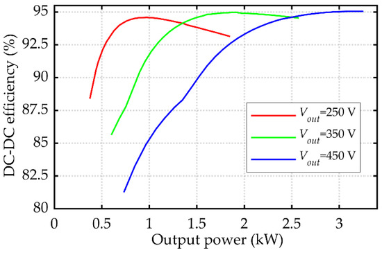 From the designed prototype, the experimental results at the rated power are shown in Figure 18 and Figure 19. The plates in the coupler were well aligned. In order to reduce the switching losses and improve the system’s efficiency, zero-voltage turn-on should be achieved for the switching devices. By slightly reducing the value of inductor L2, the ZVS condition was realized, as shown in Figure 18a,b. The waveforms of the input voltage and current were almost in phase and the ZVS condition was achieved by a phase shift of the input current. At the rated input and output DC voltages, about 3.2 kW power was delivered from the DC source to the electric DC load and resistors with an efficiency of 95%. The transmission efficiency under different output power is shown in the Figure 19. With different output voltages, the maximum system efficiencies were both higher than 94.5%.