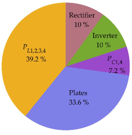 The power loss distribution of the presently designed system was analyzed. According to the calculation method that was proposed in [44,63,64], the power losses in the MOSFETs, diodes, inductors, and capacitors were obtained. Based on the on-resistance and switching-off current, the losses in the switching devices could then be calculated; the losses in the inductors and capacitors were obtained from the measured quality factors. The remaining losses are from within the coupling plates. As shown in Figure 20, the inductors and capacitive coupler dissipate 39.2% and 33.6% of the total loss, respectively, which makes up the main losses of the system.