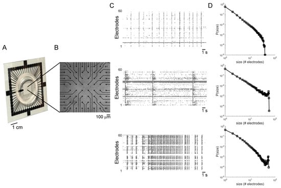(A) Micro-Electrode Array (MEA) made up of 60 electrodes. (B) Example of a cortical network coupled to a MEA. (C) Three examples of electrophysiological activity exhibited by three different cortical networks and (D) corresponding distributions of avalanches size.