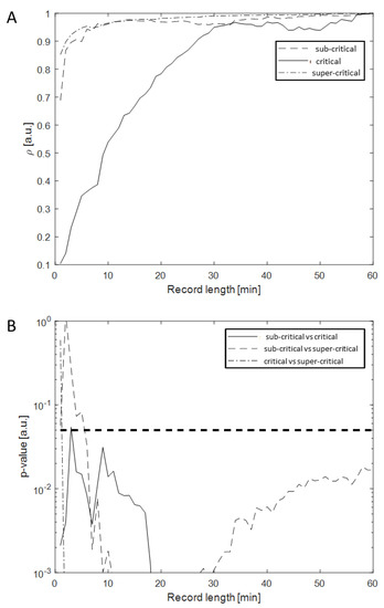 (A) Pearson correlation coefficient trend w.r.t. the recording time. The correlation is computed among the vector of ApEn values estimated from the record length reported in abscissa and the vector of ApEn values estimated from the full-length record (60 min). Each curve is relative to the different dynamical states depicted in Figure 1. (B) Trend of p-value, as estimated by a pairwise Wilcoxon signed rank test followed by a Bonferroni correction, w.r.t. the sub-record length. The dashed horizontal line represents the confidence level of 0.05.