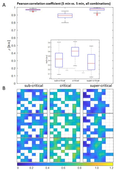 Figure 2 shows the distributions of ApEn for the three different cultures which resulted in a statistical significant difference as assessed by an unbalanced ANOVA (p < 0.01). The upper panel (Figure 2A) shows that the culture in the critical state exhibits the largest overall value of ApEn resulting statistically different from the sub-critical and super-critical culture (both p < 0.01, Mann–Whitney U-tests with Bonferroni correction). The spatial distributions of ApEn values over the MEA layout are shown in Figure 2B.