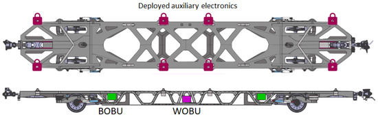 From a taxonomy point of view, the functions needed for the digitalisation of the freight railways could be categorised into several concepts and objectives, as presented in the following subsection. On the practical side, the Wagon On Board Units (WOBU) are installed on the wagons and they are all interconnected for the variety of functions deployed on each wagon and on the complete train. In addition, auxiliary electronic systems are deployed in the wagon to actuate and sense on the elements, as illustrated in Figure 1, where WOBU stands for Wagon On Board Unit and BOBU stands for Bogie On Board Unit. The functions executed with the system on board that are listed in the next subsection have different level of needs for processing, communications and latency, as will be explained below.