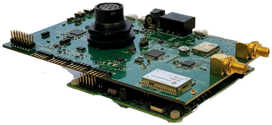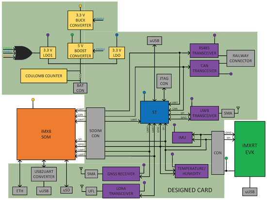 - Sensors: The LSM6DSL [20] MEMS sensor IC is included in the designed card. It features a 3D digital accelerometer and a 3D digital gyroscope. The LSM6DSL has a full-scale acceleration range of up to ±16 g and an angular rate range of up to ±2000 dps. Moreover, a 4 kbyte FIFO memory is available for dynamic data batching. It is connected to the controllers through an SPI interface.The BME280 [21] humidity, barometric pressure and ambient temperature sensor is also integrated. It features a low power consumption in sleep mode and an SPI interface.The NEO-M8T [22] module receiver has been included in the designed card to support BeiDou, GLONASS and Galileo constellations. An active antenna that is connected to an SMA connector is designed. The ST and iMX8-SOM can interact with the GNSS module using an UART interface. As a note, the UWB technology could also be used as a sensor for the diverse functions foreseen on the freight railways’ digitalisation.