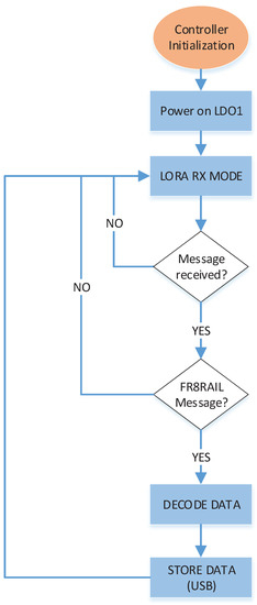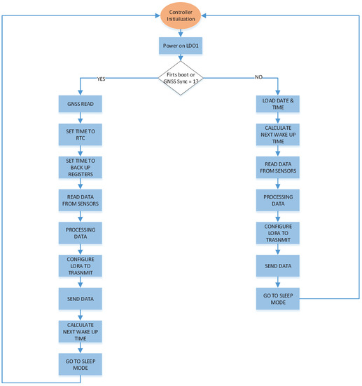 Figure 5. Flow chart of the Master node implementation. - Sensor Node:Figure 6 shows the workflow for the sensor nodes. If it is the first boot, the node performs a clock synchronisation routine. To do this, it activates the GNSS receiver. It extracts the time values obtained from the Navigation NAV-PVT (Position, Velocity and Timing) message provided by the sensor to write them in the internal clock of the ST microcontroller and the backup registers. If it is not the first startup of the sensor node, the reading of the GNSS sensor is disabled, and the synchronisation of the internal clock of the ST is directly performed by reading the values stored in these backup registers. Once the sensor nodes are synchronised, the data obtained from the sensors, such as the temperature, humidity sensor and the accelerometer are read, this data is converted to hexadecimal format and packed. Subsequently, the LoRa chip is configured in transmitter mode, and the packet is sent. Finally, the clock values are read to calculate the time that the node must remain in sleep mode until the next cycle of measurements begins.