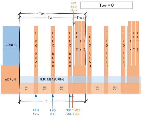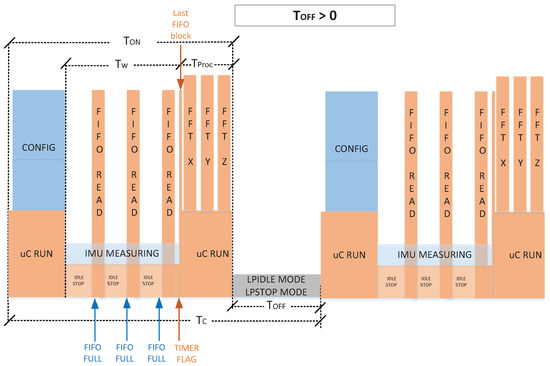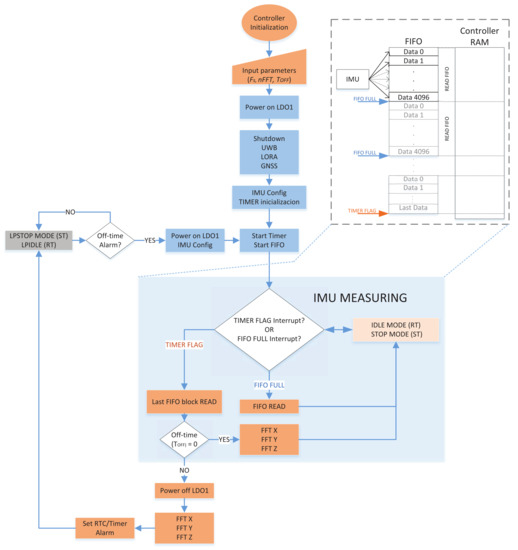 Figure 7. Flow chart of the proposed processing implementation.At startup, the controller initialisation is carried out with the parameters preconfigured. The controller enables the LDO1 that feeds sensors and communication devices. Afterwards, the IMU is configured according to the user-specified parameters while wireless communication devices are set in shutdown mode. Finally, the timer configuration is done. Once at this point, the initial configuration has finished, and an infinite loop starts.The loop begins when the controller timer and the IMU’s FIFO starts. The timer is set with the time window () to be measured according to the user-specified parameters, and thus the timer flag interrupt will be triggered when this time is elapsed. The FIFO interruption will be triggered when it is full of data acquired by the IMU. If none of these interrupts is triggered, the controller will be in a low power state (IDLE mode for RT, STOP mode for ST and nothing for iMX8, which does not have low power mode) while the IMU will be capturing and saving samples in the FIFO. If the FIFO interrupt is triggered, the entire FIFO memory block will be immediately read. Once it is read from the FIFO, it is cleared. It will be stored in the controller’s RAM, and then the controller will return to the low-power state. If the timer interrupt flag is set, the data found in the FIFO will be read up to that moment. At this point in the process, the acceleration data for all three axes during that time window () is in the controller’s RAM. In the case that the off-time () is 0, the controller will process the FFTs of the three axes, and it will return to the low power mode. The IMU does not stop in this case, so the FIFO continues filling with new data while the controller processes the FFTs. In the case that the is greater than 0, the controller will disable the LDO1 and then it will process the FFTs. Then an alarm will be configured to exit from ultra-low power mode (LPIDLE mode for RT, LPSTOP mode for ST and nothing for iMX8, which does not have ultra-low power mode) when the expires. When this time passes, the LDO1 will be re-enabled, the IMU will be reconfigured, and the loop will be relaunched.As a note, is the time in which the node is in sleep mode when there is room for determining a duty cycle on the operation of the function.The FIFO memory has a size of 4096 bytes. Each sample of the IMU consists of 2 bytes either from the accelerometer or from the gyroscope. This means that the FIFO will store up to 341 sets of accelerations X,Y,Z and angular velocities , , , i.e., set of samples. Hence, the time it takes to fill the FIFO is . The time window () is set according to the user-specified number of FFT points (nFFT) and the sampling frequency (), that is . Table 2 shows the time it takes the IMU to fill the FIFO and the duration of the time window () as a function of and the nFFTs.
