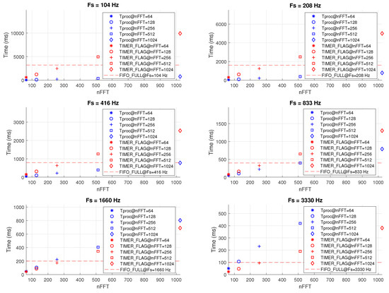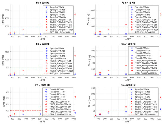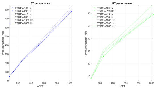 Figure 11 shows the performance of the ST and the RT controllers. It can be seen that there is a significant difference in the performance between ST and RT. This performance is more evident for FFTs with more number points. The higher the number of FFT points (nFFT), the higher the computational cost, and thus, it will be more pronounced in the ST controller than in the RT one. We can see that, in the case of the RT controller, the processing time () slope starts with a 4 ms for an nFFT = 64 points and ends with a 60 ms for an nFFT = 1024 points, approximately. In the case of ST, the slope starts with 32 ms for an nFFT = 64 points and ends with 800 ms for an nFFT = 1024 points, approximately.