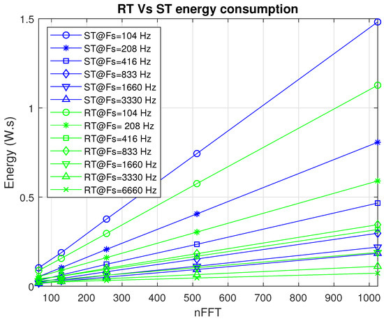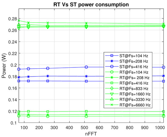 For the operating mode , , and thus, it makes less sense to calculate energy per cycle. Figure 17 shows the power consumption during each cycle as a function of the number of FFT points (nFFT) and for different sampling frequencies (). In the case of the ST controller, it is only shown the power consumption for sampling frequencies () lower than 416 Hz because it cannot perform the processing at higher frequencies at each cycle. It can be seen that the RT consumes lower power than ST for the same sampling frequencies (). Since sending the RT to the IDLE mode is impossible, the power consumption increases for sampling frequencies () greater than 833 Hz.