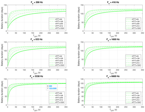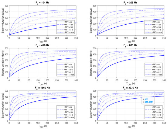 Considering these results and the FR8RAIL use case, we aim to estimate the autonomy of the proposed architecture with a battery of 3.7 V and 10,000 mAh (37 Wh). Figure 15 and Figure 16 show the battery duration for the ST and RT controllers as a function of and for different sampling frequencies (). It can be seen that the off-time is the parameter that mostly determines the battery life, that is, the longer the , the longer the time spent in ultra low power mode and, therefore, the lower the average energy consumption per cycle. In this way, the longer the , the greater the difference between the battery life for the ST than the RT one. This is logical since consumption in is lower in ST than in RT. However, when tends to zero, the battery life tends to be larger for the RT than for the ST one. On the other hand, battery life increases as the sampling frequency () decreases. This is also logical since the system remains powered on for a longer time as it has to capture the same data at a lower rate.