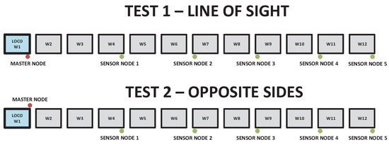 Given the centralised locomotive architecture of the digitalised freight train composition, LoRa is selected for the communication among WOBU units and LOBU with no hops to avoid limitations due to malfunctioning. To test this LoRa communication of the designed system, a firmware was developed in the ST microcontroller using only the LoRa radio layer at the 868 MHz frequency band. The device installed on the locomotive—LOBU—is used as a receiving node (Master node). In contrast, five WOBU devices are configured to obtain the data from the sensors, process the data, and send it to the Master node, where the data obtained would be stored and communicated to the FTSMS and the cloud infrastructure.