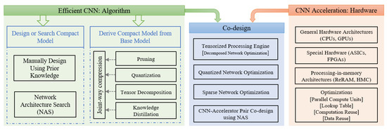 The rest of this article is organized as follows. Section 2 reviews several efficient CNN design software algorithms. These techniques range from the automatic searching of efficient networks using NAS to designing a compressed network using pruning, decomposition, quantization, and distillation depending on the base model. Section 3 highlights the hardware approaches used to accelerate the neural networks. This includes a combination of algorithm-based compression and modern hardware accelerators. Section 4 briefly discusses current efficient CNN design techniques and potential future research opportunities. Finally, we present the conclusions of the study in Section 5.