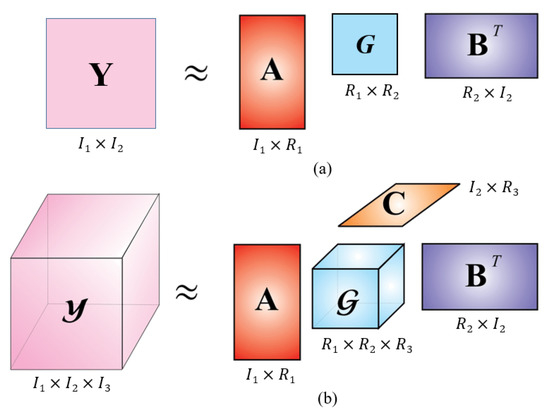 Matrix decomposition vs. tensor decomposition: (a) low-rank matrix decomposition (truncated SVD); (b) low-rank tensor decomposition (Tucker decomposition).