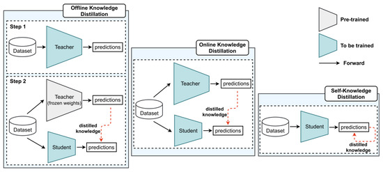 Knowledge distillation is a neural network compression technique in which a smaller or compact model (student model) is trained using information from a larger model (teacher model) about similar tasks. Knowledge distillation was first introduced by Bucilua et al. [84] and later popularized by Hinton et al. [85] for deep learning. The main challenge in knowledge distillation is how to transfer knowledge from the teacher model to the student model to achieve competitive or even better performance. In general, knowledge distillation is composed of three components: knowledge, the distillation algorithm, and the teacher–student architecture. Knowledge can take the form of logits, activations, or features from the teacher model’s intermediate layers. As shown in Figure 5, the distillation process can be offline, online, or through self-distillation. Offline distillation [86,87,88,91] distills the knowledge from the pre-trained teacher model, whereas online distillation [89,90,92] distills while the teacher and student models are being trained. In self-knowledge distillation [93,94], the student network is trained progressively using its own knowledge without requiring a pre-trained teacher model. Finally, teacher-–student architecture refers to the relationship between the selection or design structure of the student and teacher models.