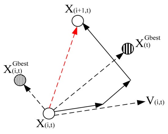where itermax is the maximum iteration of the PSO algorithm and iter shows the current iteration number. Moreover, in Equation (1), is the best position of the ith particle and is the best solution among all particles. Figure 1 shows the searching orientation of the ith particle in PSO.