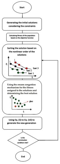 Eberhart and Kennedy first presented PSO in 1995 as a new optimization method. A key aspect of the PSO is its simplicity, such that it includes two velocity and position equations. The position vector and particle velocity vector are dependent vectors for particle i in the N-dimensional search area, which can be described as and , respectively. A community of birds comprises a number of particles that move in a limited band search area to find the optimal results. All the particles’ positions are updated according to the global and local best particle positions by following equations [22].