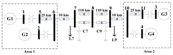 In this section, the proposed algorithm is applied to adjust the PSS parameters of the four-machine power system, and its single-line diagram is shown in Figure 4. This system has two areas that are connected via a weak connection line. There is one local oscillation mode in this system in each area, and there is one inter-area oscillation mode. The stress imposed on this system is evaluated using the real power exchanged between the two areas [25].