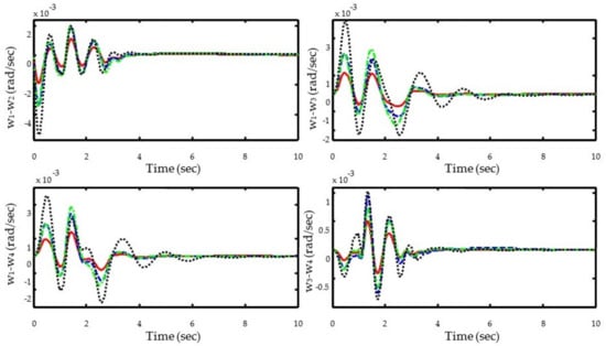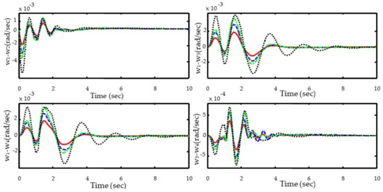 Angular velocity deviation for the first scenario for the rated load. Proposed (red line), BFA (blue dashed line), GA (green dash–dotted line), classic (black dots).