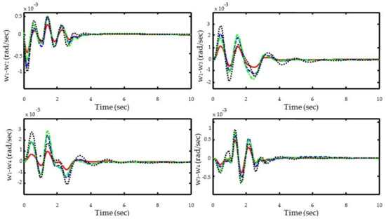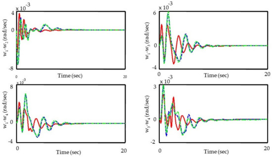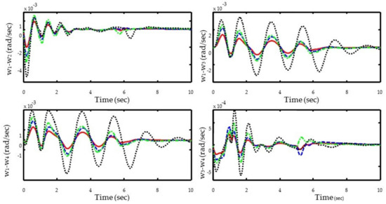 In this scenario, as mentioned, PSS is installed on all four machines. The results obtained from this algorithm are compared with those of the methods given in Table 3. Figure 5 shows convergence variations of the system of study. Figure 6, Figure 7, Figure 8 and Figure 9 shows the changes in the generator speeds. The genetic algorithm (GA) and the bacteria foraging algorithm (BFA) were also used to design the PSSs. The optimal parameters obtained for the PSS are given in Table 3.