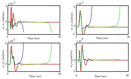 Angular velocity deviation for the first scenario for low load; proposed (red line), BFA (blue dashed line), GA (green dash–dotted line), classic (black dots).