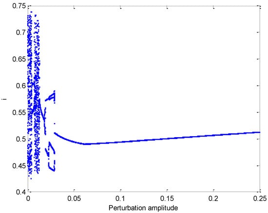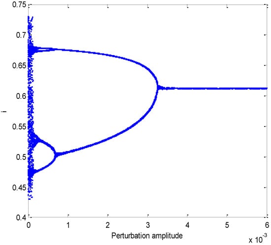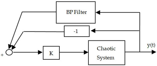 Next, the authors present one of the possible approaches with closed loops to stabilize the unstable periodic orbits []. This method relies on perturbing a system variable instead of a control parameter. This feature is preferred in all the cases where the control parameters are strongly influenced by external conditions and their alteration is harder to achieve. To illustrate, we consider the control diagram described in Figure 2.