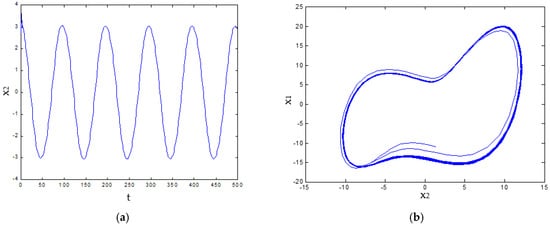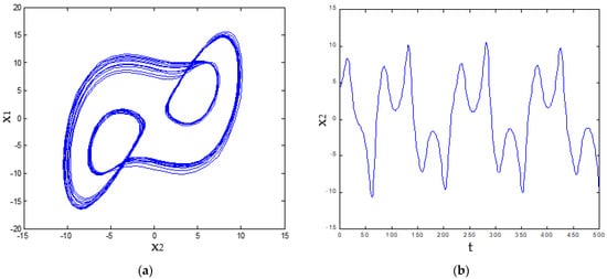 The evolution of the Lorentz system, described by the state x2 of the differential equation system (t, x2), is shown in Figure 3b, and the chaotic attractor (x2, x1) is shown in Figure 3a.