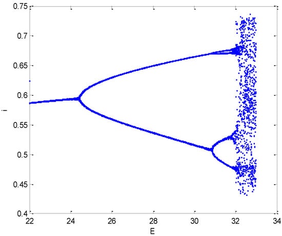 A way to visualize the dynamic behavior of the buck converter (the parameters of the buck converter are given in Appendix A) is the bifurcation diagram, exemplified in Figure 9, where the evolution towards chaos is achieved by changing the supply voltage between 22 and 33 V.