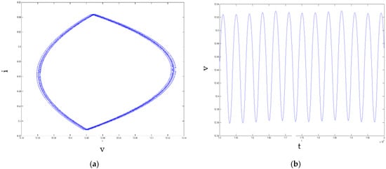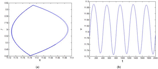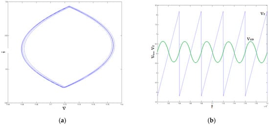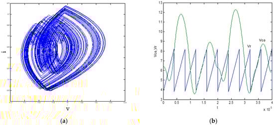 According to the previous graph, the buck converter exhibits chaotic behavior for supply voltage values over 32.27 V. Figure 10a,b illustrate, for a supply voltage of 33 V, the evolution in the state space and the control voltages of the buck converter.