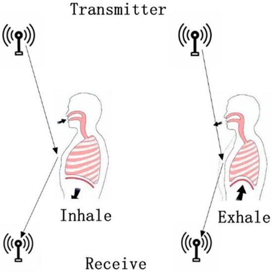 The system proposed in this paper is based on software defined radio technology to obtain the respiratory condition caused by heart failure through CSI. In this experiment, the breathing human body was used as a reflector to map the movement of the relative position of chest and abdomen in the process of breathing to the phase and amplitude changes caused by the length change of the reflection path, so as to establish a quantitative mapping between human breathing activity and CSI signal fluctuation []. During respiration, the chest fluctuates periodically with a displacement distance of 4.2–5.4 mm []. However, when Cheyne-Stokes respiration occurs in patients with heart failure, the chest displacement distance can be increased to 12.6 mm []. The specific schematic diagram of detecting breathing is shown in Figure 1. Based on the specific circumstances of the above medical exploration, it can be seen that the chest displacement of healthy people and patients during breathing is significantly different, and the CSI data based on physical background mapping will also be significantly different. Based on this theory, this paper proposes a system to detect patients with heart failure accompanied by Cheyne-Stokes respiration.
