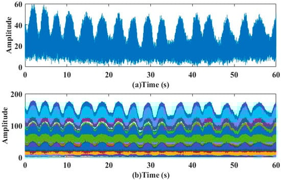 Figure 2a shows a subcarrier waveform of breathing conditions of a normal person in a calm state within one minute, collected in a static environment without interference. It can be clearly seen from the figure that the amplitude information is similar to a cosine function, presenting a periodic fluctuation state, and the respiratory rate is relatively stable. Figure 2b shows the situation of 64 subcarriers of data collected at one time in the experiment. In previous studies, the respiration waveform was basically a sinusoidal waveform []. The experimental waveform is consistent with the sinusoidal waveform. Waveform data contains amplitude information and phase information, among which a large number of experiments have found that sampling frequency deviation, symbol timing deviation and carrier frequency shift deviation will cause an excessive phase amplitude change. Therefore, phase information is difficult to be used as a detection method to identify Cheyne-Stokes respiration in patients with heart failure. Relatively speaking, the amplitude data is easy to obtain, and can reflect the breathing situation more intuitively and efficiently. Therefore, it is feasible to carry out Cheyne-Stokes respiration detection in patients with heart failure based on amplitude signal in this paper.