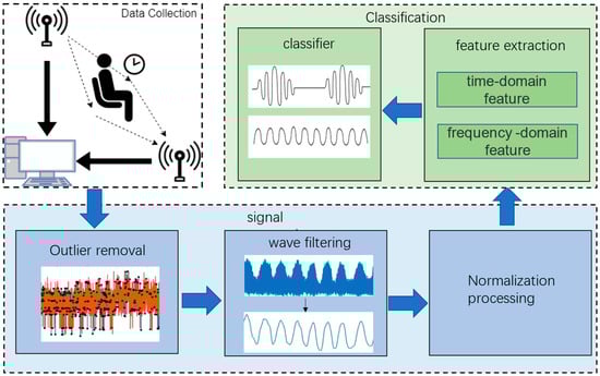 The Figure 3 describes the overall framework of the system, which is mainly divided into three parts. The experimental environment shown in the upper left corner consists of a computer and two USRP devices with antennas. The following module introduces the data pretreatment method, which is mainly divided into three steps: eliminating outliers, filtering and data normalization processing. The upper right corner introduces the feature extraction method and machine learning classifier. Finally, a classification model was established to effectively distinguish Cheyne-Stokes respiration from normal respiration in patients with heart failure.