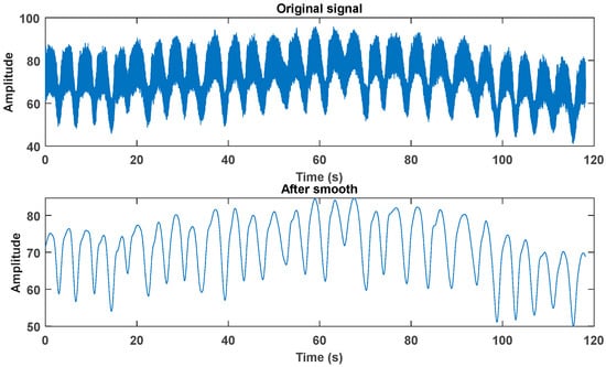 In this experiment, the subjects always kept a sitting position, and the experimental equipment collected the ordinary breathing of each participant for two minutes in real time, which was repeated ten times. Then, the apparatus took the subjects’ Cheyne-Stokes respiration for two minutes in real time, and repeated them 10 times. The two-minute collection time was chosen here, as Cheyne-Stokes respiration cycles range from 30 s to 2 min. When collecting the signal, it can be seen that with the slight undulating movement of the chest and abdomen during breathing, the amplitude of the collected signal will undergo a certain change.