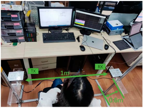 The test area of this experiment is located in an independent room of 5 m × 6 m. The transmitting antenna and receiving antenna are 1 m apart, and both antennas are located at a height of 59–77 cm. The subject sat in a relaxed posture between the two antennas at a slightly backward position of 10–20 cm, and when the subject sat on a chair between the antennas, the height of his abdomen was exactly the same as the height of the two antennae. The reason for taking seated breathing is shortness of breath due to heart failure, or even coma in severe cases. Sitting breathing can reduce shortness of breath during sleep. The specific experimental conditions are shown in Figure 6.