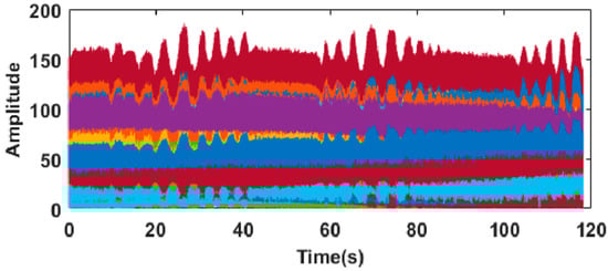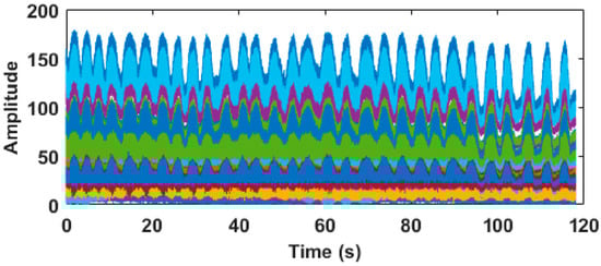 The normal breathing data collected in Figure 7 is shown below, which shows the waveform of 64 subcarriers when the subject is breathing normally. In the figure, the horizontal axis represents the 120-s acquisition time in seconds, and the vertical axis represents the subcarrier amplitude. The breathing rhythm of normal adults is stable, uniform and orderly, and the breathing rate is 12–20 times per minute when it is quiet. It can be clearly seen from Figure 7 that the breathing times detected within 120 s counted 30 times, which is in line with the above medical common sense.